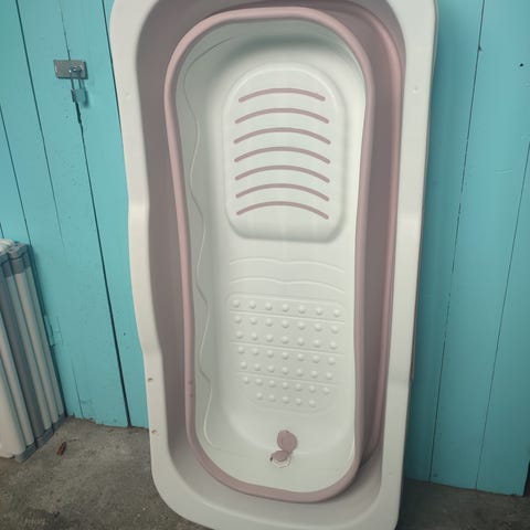 Folde badekar fra Tubfamily med låg og opbevaringsbakke i lyseblå plast