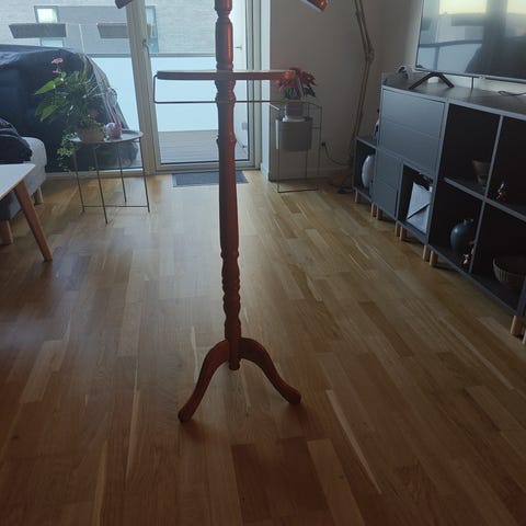 Knap 114 cm høj. Står ok stabilt, men ville nok kunne stå endnu bedre med en ekstra skrue nedefra og op.