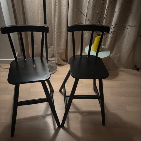 IKEA børnestol i sort. Klassisk træstol med ryglæn bestående af lodrette tremmer og firkantet sæde. Egnet som siddeplads til børn ved bord eller i børneværelse. Neutral farve, der passer ind i mange indretninger.