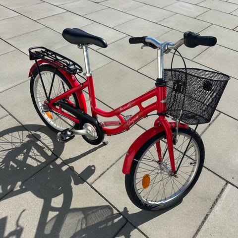 MBK børnecykel med 20” hjul. Cyklen har grøn stel og er udstyret med skivebremse foran og fodbremse bagpå. Der er monteret skærme og støtteben. Egnet til børn, der passer til 20” hjulstørrelse.