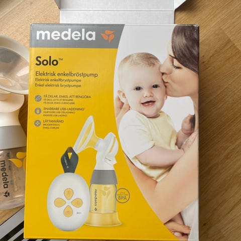 Medela Solo Hands-free elektrisk enkeltbrystpumpe til udmalkning af brystmælk fra ét bryst ad gangen. Brugt ifbm. ammeopstart og til nattevagter til hurtigt og effektivt få pumpet ud, fungerer problemfrit.