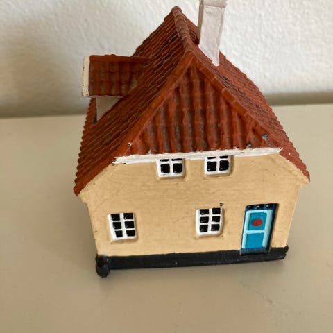 Hus i miniatureudgave med rødt tegltag, skorsten og kviste. Etiket i bunden, hvor modelnummer og navn fremgår.