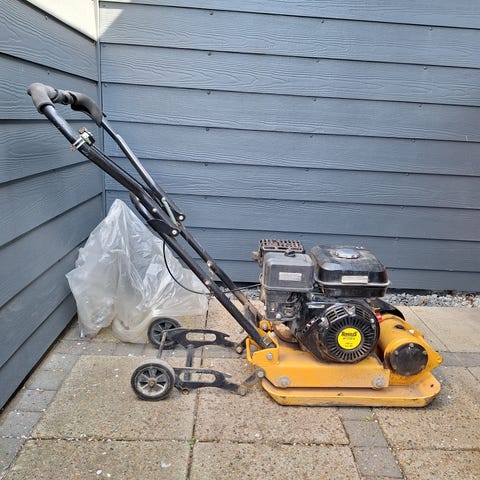 Pladeviberator med vandtank (så det ikke støver når man kører med den) den starter og kører godt. Vejer 100 kg uden vand.