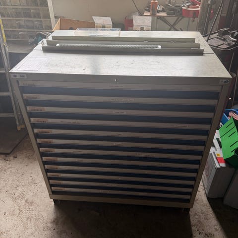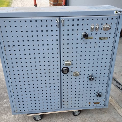 2 stk. Kvalitets Metalskab fra Blika i grå farve fremstillet i stål. Skabet har to låger med greb på fronten. Velegnet til opbevaring i fx garage, værksted.