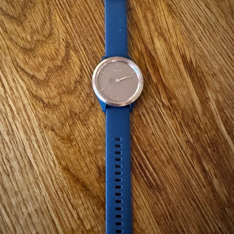 Garmin Vivomove HR smartwatch med analogt urdisplay kombineret med digital skærm. Uret har rund urskive og leveres med beige silikonerem med justerbar lukning. Egnet til daglig brug og aktivitetsovervågning, herunder visning af tid, dato og forskellige aktivitetsdata på den indbyggede skærm.