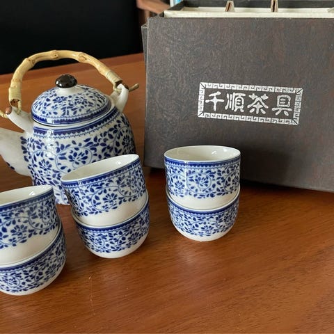 Tesæt bestående af tekande og fire kopper i hvidt porcelæn med asiatisk skriftmotiv. Tekanden har hank i naturfarvet materiale og matchende låg. Kopperne er uden hank og har samme dekoration som tekanden.