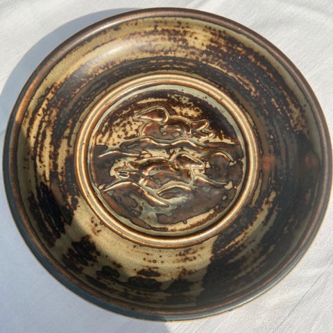 Palslius Danmark stentøjsskål i grå nuancer med spættet glasur. Skålen har en let forhøjet kant og dekorativ detalje langs siden. Undersiden er signeret med "Palshus” Danmark nr 217. D: 15 cm. H: 2,5 cm.. Kan sendes efter aftale
