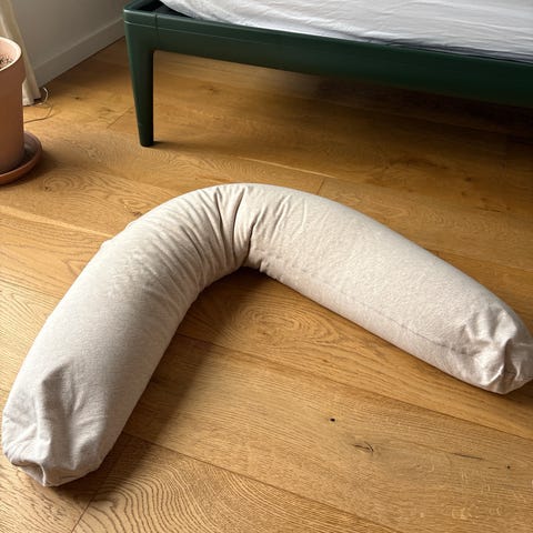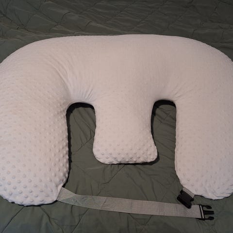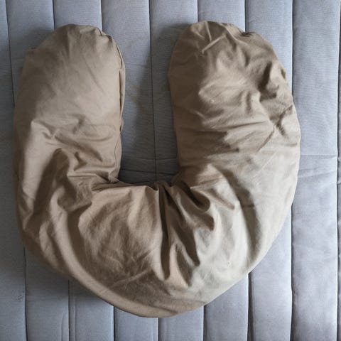 Doomoo ammepude i beige. U-formet pude, der kan bruges som støtte ved amning eller flaskegivning. Puden giver støtte til både barn og voksen og kan også anvendes som støttepude til barnet, når det ligger eller sidder. Betrækket har et diskret mønster og kan tages af via lynlås (hvis relevant for modellen). Velegnet til brug i hjemmet, i sofaen eller i sengen.