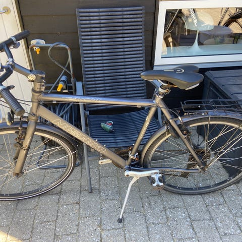 Nishiki hybridcykel med stelstørrelse 61 cm og 28"/700c hjul. Cyklen har klassisk herrestel med lige styr og udvendige gear. Der er monteret bagagebærer, støtteben, skærme. Velegnet som pendler- eller hverdagscykel på asfalt og cykelstier. MINIMUM vedligeholdelse da den er med rem træk!