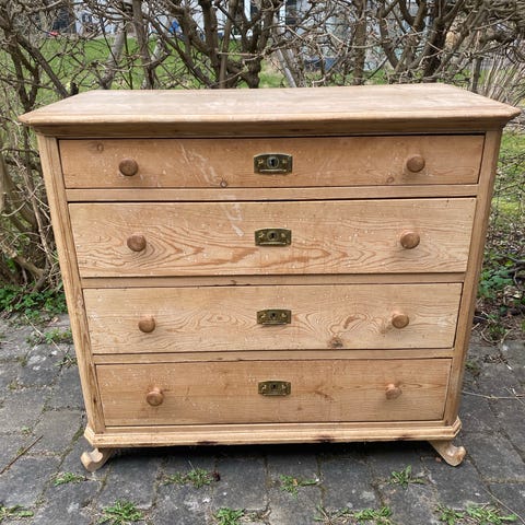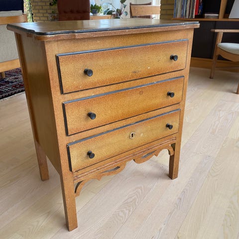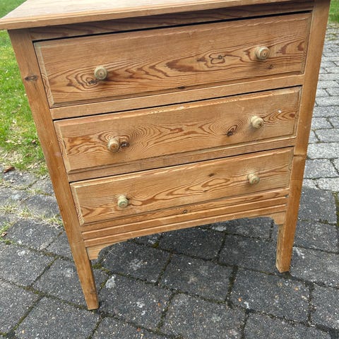 Står lakeret med forventelig patina. 3 skuffer. Skuffer og plade er massiv fyrretræ. Stel massiv bøg. Stemplet FDB - se sidste billede.