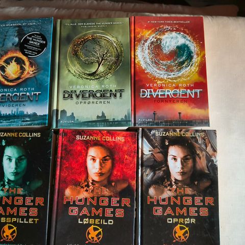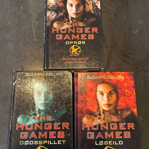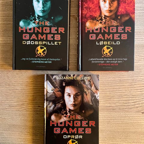 Suzanne Collins The Hunger Games bogsæt med både danske og engelske udgaver. Sættet indeholder tre engelske paperbackbøger: The Hunger Games, Catching Fire og Mockingjay. Derudover tre danske hardbackbøger: Løbeild, Oprør og Dødsspillet.