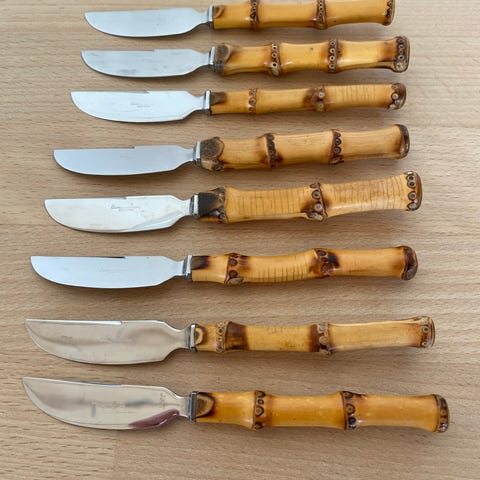 Antikke Kay Bojesen smørknive med bambus håndtag. Sæt af 6 stk. Knivene har blad i metal og skaft udformet som bambus i en lys træfarve. Sættet egner sig til servering af smør, pålæg eller bløde oste ved borddækning.