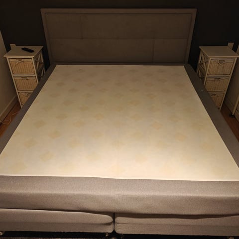Jysk seng med gavl i grå stofbetrukket ramme. Sengen består af to boxmadrasser med fælles topmadras og en enkel, lige hovedgavl. Stoffet fremstår i en mørkegrå nuance, og sengen står på små runde ben. Velegnet som dobbeltseng i soveværelse eller gæsteværelse.