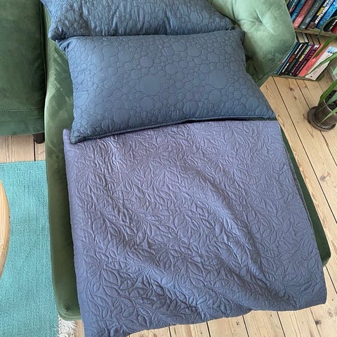 To puder i vinrød farve med inderpuder. Puderne er specielsyet af en syerske. Stof af uld blanding. Rektangulær model med lynlås, så betrækket kan tages af og vaskes. Tekstil i grovvævet struktur med små farvegnister. Velegnet som pyntepude eller rygpude i sofa eller på seng. På billederne ses et lille hul i stoffet. Nem at reparere.