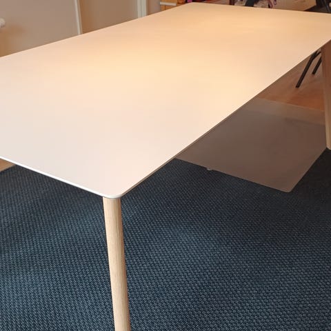Står næsten som nyt - er kun blevet brugt i sommerhuset, og altid med dug på. Der er en lille ridse i bordet (se billede), idet en radio blev tabt på bordet. Bordet er 200 cm langt, og kan forlænges med en plade til 245 cm - pladen er kun brugt en enkelt gang før.