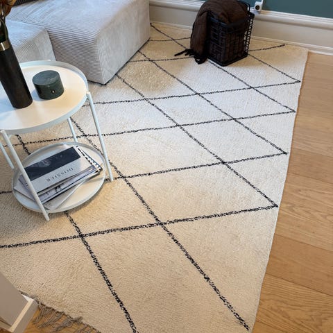 Rektangulært tæppe i lys/hvid bundfarve med sort, grafisk diamantmønster. Tæppet har kort, tæt luv og en skridsikker bagside. Velegnet til stue, soveværelse eller andre opholdsrum, hvor der ønskes et enkelt, geometrisk udtryk på gulvet.