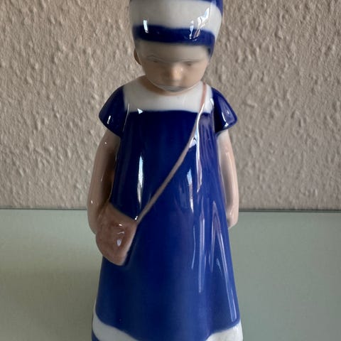 Bing & Grøndahl porcelænsfigur modelnummer 1568. Figuren forestiller en pige i blå kjole, der sidder på knæ med en mindre dreng i armene. Glasuren er blank i blå, hvide og brune nuancer. Undersiden er mærket med B&G-stempel og modelnummer 1568 A, Made in Denmark. Velegnet som dekorativ figur i fx stue, vitrineskab eller samling af dansk porcelæn. Ingen skår. Kan afhentes i 7171 Uldum