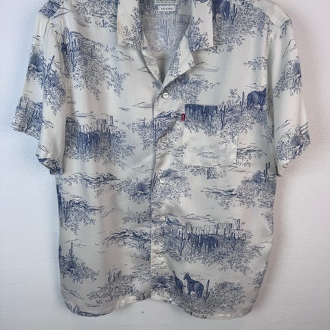 Levi's skjorte til mænd i størrelse M. Skjorten er fremstillet i bomuld og har et multifarvet camouflage-inspireret mønster. På ryggen er der broderi med ørn og teksten "San Francisco California". Modellen har lange ærmer, klassisk krave og gennemgående knaplukning foran. Egnet som let overtøj eller som almindelig skjorte i hverdagen.