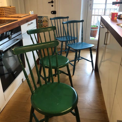 Stol malet sort, og med patina. Stolen funktion stabil.