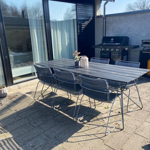 Havebord og 6 havestole i grå kunststof. Bordet har lamelbordplade og metalstel, og stolene har fletlook i kunststof med armlæn og metalben. Sættet er egnet til udendørs brug på terrasse eller i have. Bordpladen har synlige skader med revner i nogle af lamellerne, som fremgår af billederne.