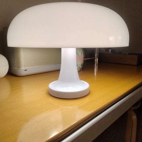 Virkelig flot lampe i plast og egetræ, fra spanske Marset. Lampeskærmen kan tiltes og den lyser let hjørner op. Den har tre styrker.