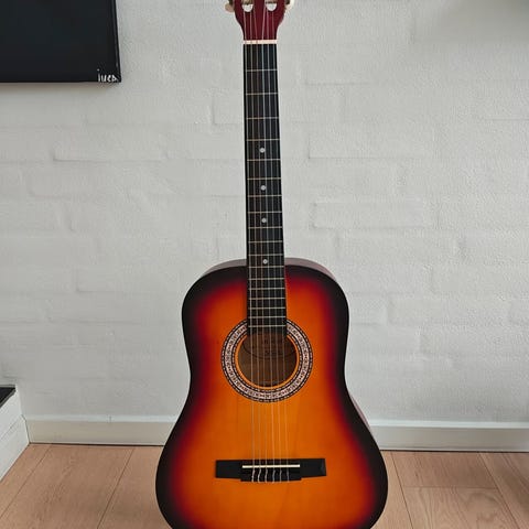 Ny og ubrugt 4/4 (39”) spansk / klassisk voksenguitar i farven mat sunburst. Guitaren er med nye strenge.