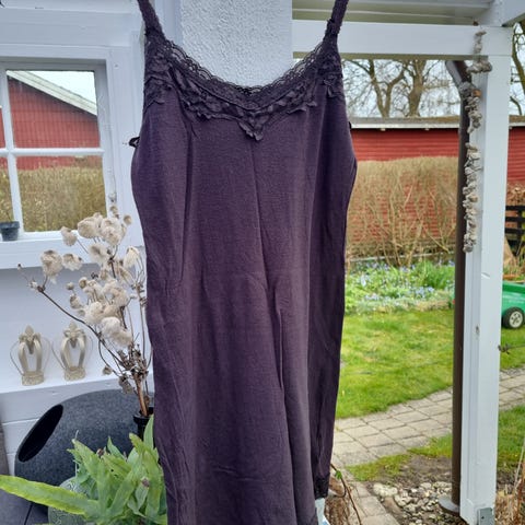 H&M natkjole til dame i str. S. Kjolen er lilla/lyserød/sort og fremstillet i polyamid. Modellen har tynde stropper som kan justeres og blondekant foroven samt let, gennemsigtig meshstruktur. Egnet som natkjole eller loungenattøj. Kan afhentes i Rødovre, Ølstykke eller sendes hvis køber betaler portoen.