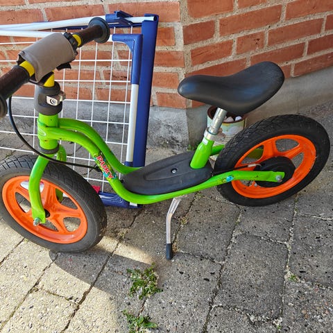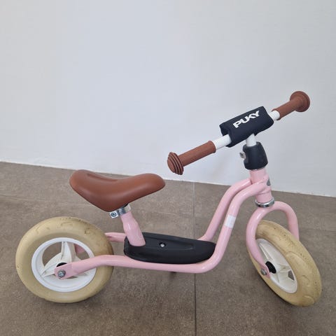 Puky løbecykel i pink med hvidlige hjul og brun saddel og håndtag. Cyklen har fastmonteret flettekurv foran og ringeklokke på styret. Egnet til børn fra 2 år