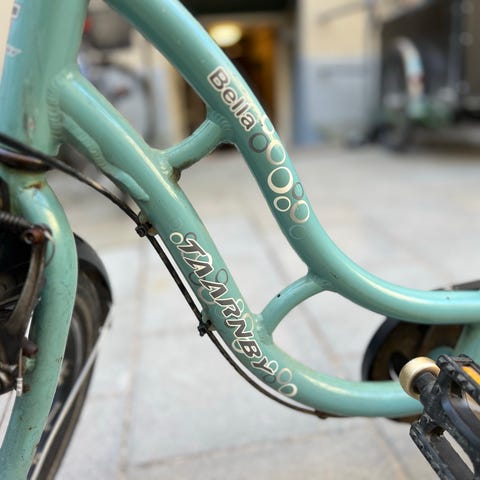 Grøn cykel fra my dino. Kører stadig fint men har altid stået ude :) god som første cykel eller cykel som kan stå i børnehaven.