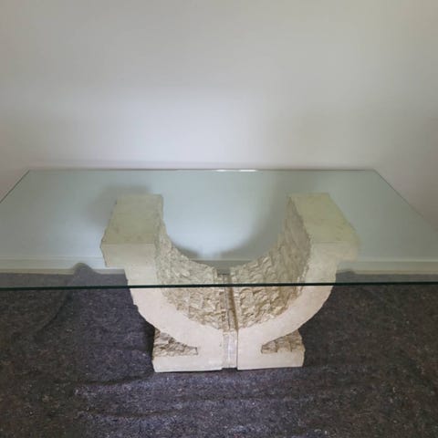 Sofabord i sortbejset træramme med en klar glasplade i midten og en praktisk hylde under