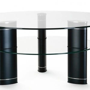 Moderne sortbejset sofabord med hylde, glasplade i midten, forkromede ben.