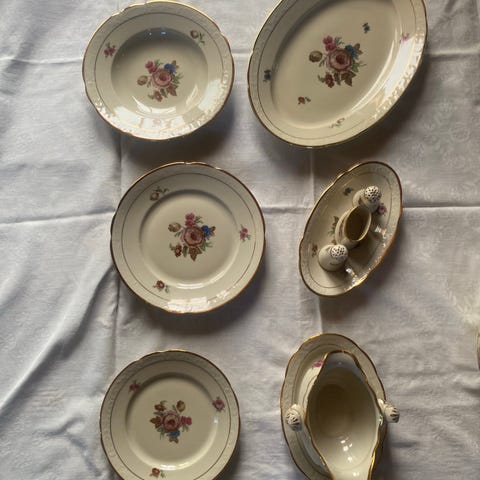 Rosenborg Porcelæn stel med tallerkener, fade og sovsekande. Stellet er hvidt/cremefarvet med blomsterdekoration i midten og langs kanten samt guldkant rundt om. Tallerkenerne har præget mønster langs kanten. Sættet omfatter flere dybe og flade tallerkener i samme design samt ovale serveringsfade og en sovsekande med hank og tud. Velegnet som middags- og serveringsstel i ensartet klassisk stil.