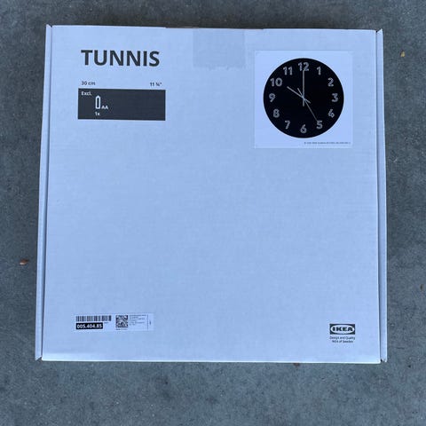 Ikea TUNNIS vægur med en diameter på 30 cm. Uret har sort urskive med tydelige tal og visere. Drives af 1 stk. AA-batteri (medfølger ikke). Velegnet til ophæng i fx køkken, stue, kontor eller værelse.