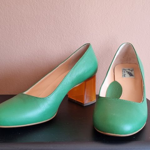 Zara højhælede sko i størrelse 36. Skoene er grønne med kontrastsyninger og lille hæl i trælook. Lukket tå med dekorativ remdetalje foran. Velegnet som pæne hverdagssko eller til mere formelle anledninger.