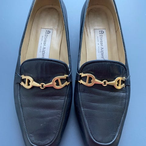 loafers og sejlersko i str. 37. Skoene er sorte med guldfarvet kædedetalje over vristen og lav hæl. Klassisk slip-on model, velegnet til hverdagsbrug eller kontorbrug. Materiale fremstår som glat, skinnende overflade. Indvendig sål og for er i en brunlig tone. Skoene har lukket tå og hæl og en fast gummisål med mønster for bedre fodfæste.