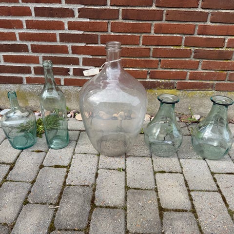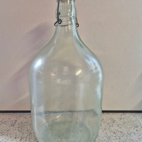 Lille gl. ballon flaske i fin grøn nuance til dekoration eller som lysestage. Sendes gerne på købers regning.