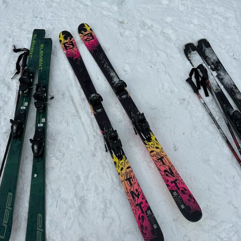 Skiene er twintips/all-mountain, og er 188cm høje. Der følger et par stave med på 120cm, samt en ski taske til at transportere dem.