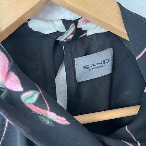 Saint Tropez sommerkjole til kvinder i størrelse L. Kjolen er blå med blomstermønster og fremstillet i polyester. Modellen har lange ærmer og knaplukning foran samt bånd ved halsen.