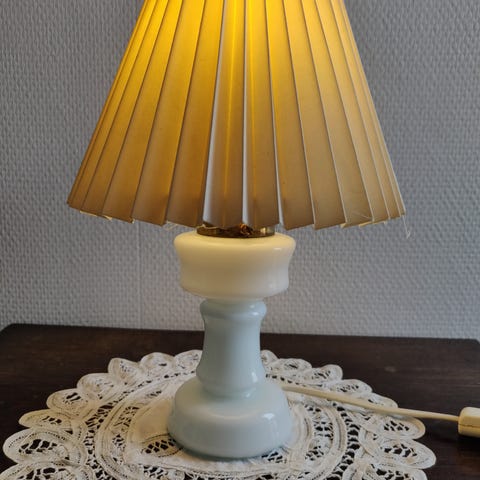 Bordlampe i glas med hvidmalet bagside. Ét sted er der en revne i den hvide maling, men ikke i selve glasset (se billede).
