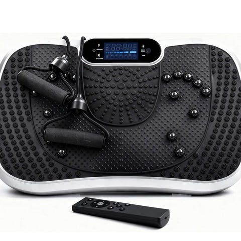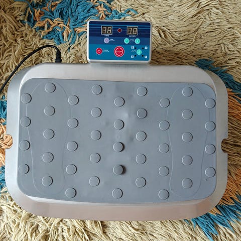 Hypervibe Performance vibrationsplade til helkropsvibrationstræning. Maskinen har håndtag og display med tids- og programindstillinger på fronten. Træningspladen har skridsikker overflade og medfølgende elastikker til øvelser. Velegnet til hjemmetræning af hele kroppen med forskellige vibrationsprogrammer og intensitetsniveauer.