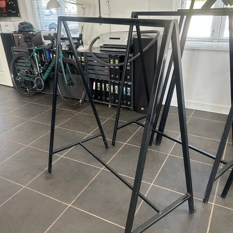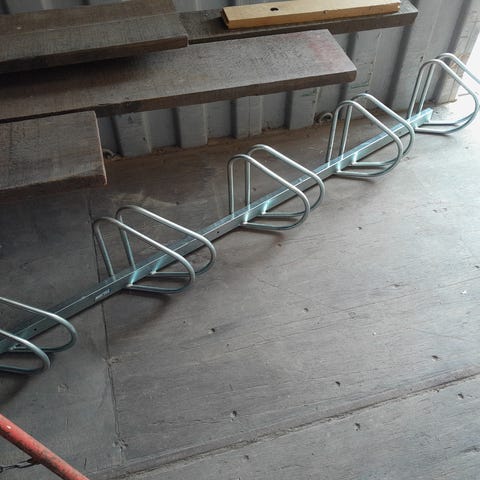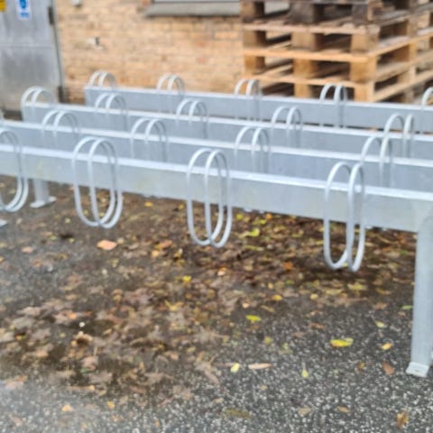 Cykelstativ i galvaniseret stål. Stativet er udført i kraftige stålrør og -profiler med flere bøjler til parkering og opstilling af cykler. Galvaniseringen giver en robust overflade, der er velegnet til udendørs brug. Egnet til montering på fast underlag ved f.eks. skoler, virksomheder, boligforeninger eller offentlige områder, hvor der er behov for organiseret cykelparkering. Eks. Type 4 m/ 5 pladser 600 kr eller type 2 konisk m/5 pladser 750 kr. type 2 dobbelt m/ 10 pladser 1400 kr. søjler til cykelstativer pr.stk. 200 kr. antal kan købes efter ønske.