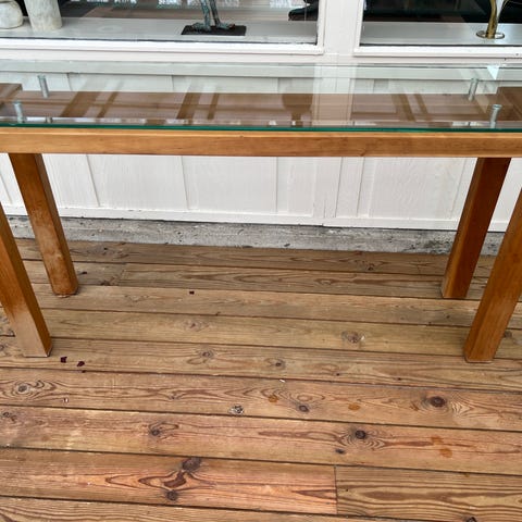 Venture Home sofabord i klart glas. Bordet er udført i bøjet glas med en bordpladetykkelse på ca. 1 cm. Mål: længde ca. 110 cm, bredde ca. 50 cm og højde ca. 38 cm. Hele bordet, inklusive ben/sokkel, er i glas, hvilket giver et enkelt og transparent udtryk, velegnet som sofabord i stue eller opholdsrum.