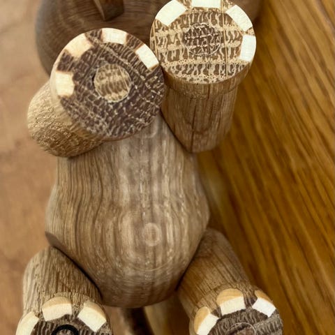 Træ frø-rasleinstrument i mørkt træ. Figuren er udskåret som en frø med takket ryg og hulrum til medfølgende træpind. Når man stryger eller slår med pinden hen over ryggen, frembringes en rasle- eller kvækkende lyd. Egnet som lille percussion-instrument eller dekorativ figur. Materiale: træ. Farve: mørk brun.