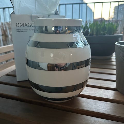 Kähler Omaggio vase i keramik med vandrette striber. Vasen har en rund, buet form og en forholdsvis smal åbning foroven, velegnet til både afskårne blomster og dekorative grene. Klassisk Omaggio-design med tydelige striber, som kan indgå i forskellige typer boligindretning. Bundstempel med Kähler-logo og designerangivelse.