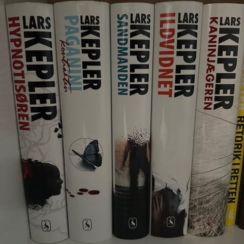 Lars Kepler krimiserie bøger. På billedet ses blandt andet titlerne "Kaninjägaren", "Playground", "Stalker", "Pagani" og "Hypnotisøren". Bøgerne er indbundet hardback-udgaver og tilhører samme krimiserieunivers. Velegnet til læsere af nordisk krimi og spændingsromaner.
