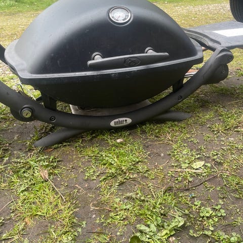 Weber Q2000 gasgrill i sort. Kompakt grill velegnet til terrasse, altan eller camping. Grillen tilsluttes gas via slange, som ses på billederne. Låget kan lukkes under tilberedning, og grillen har integreret stel, så den kan stå direkte på et bord eller en plan overflade. Egnet til almindelig grillning af kød, grøntsager og andre grillretter udendørs.