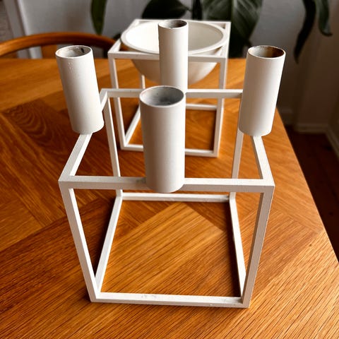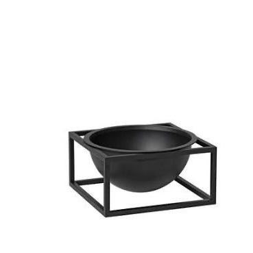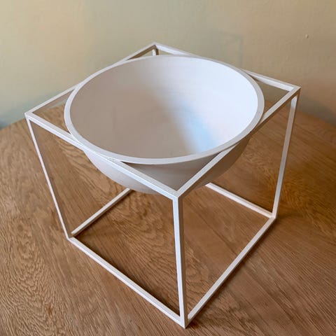 by Lassen skål på kubestativ i hvid. Skålen er placeret i en åben, kubisk ramme i metal. Højden på stativet er ca. 30 cm, som vist på målebåndet. Egnet som dekorationsskål til fx bord eller reol. Enkel og geometrisk udformning i lys farve, der passer ind i mange indretningsstile.