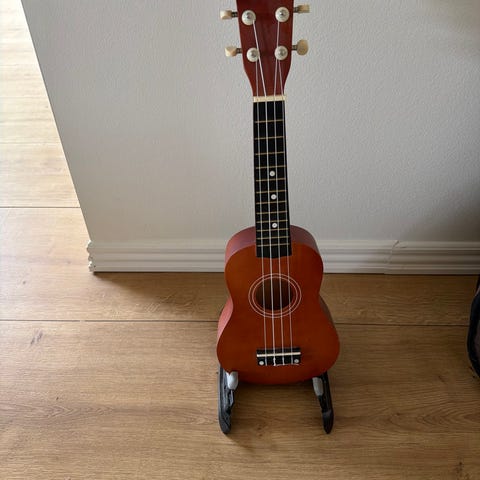 Ukulele i pink farve. Medfølgende blød taske med lynlås og bærehåndtag, egnet til opbevaring og transport af ukulelen samt plektre.
