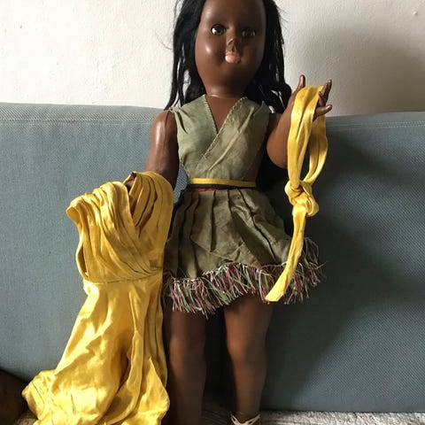 Dukke mulat ca 40 cm, gammel. Rigtig sød og velholdt. Iført røde bukser og vest af fløjl. Retro.