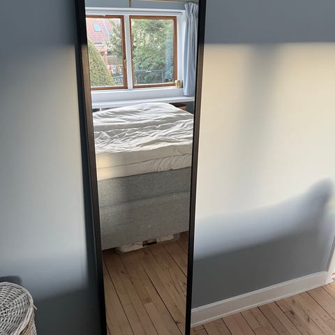 IKEA spejl med sort ramme. Rektangulært spejl i fuld længde, egnet til ophængning på væg eller opstilling op ad væggen. Passer til soveværelse, entré eller garderobe til helkropsspejling.